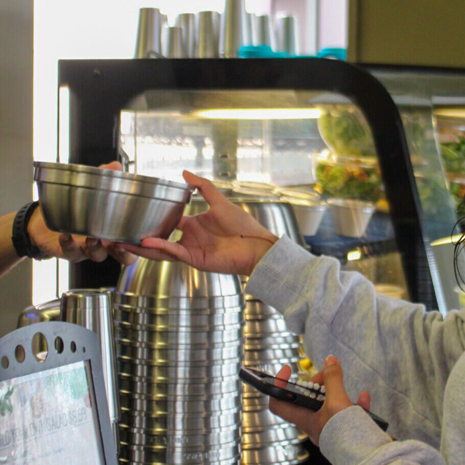 Students ordering from reuse-activated locations receive their meal in a premium stainless steel container for a waste-free, convenient experience.